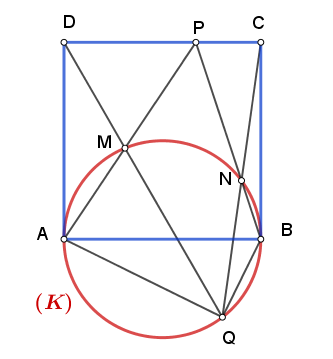 Δίνεται τετράγωνο $ABCD$ και ο κύκλος $(K)$ διαμέτρου $AB$. Ένα σημείο $P$ κινείται στην πλευρά $$CD$ και οι $PA,PB$ επανατέμνουν τον κύκλο στα $M,N$ αντίστοιχα.