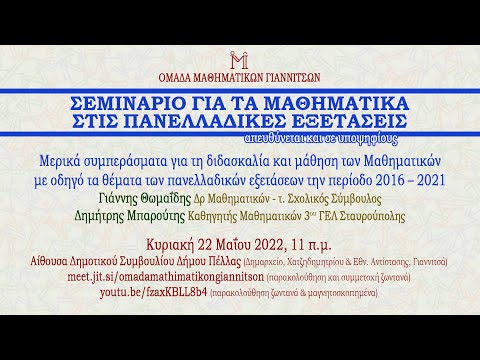 Η Ομάδα Μαθηματικών Γιαννιτσών διοργάνωσε την Κυριακή 22 Μαΐου 2022 στις 11 π.μ. Σεμινάριο για τις Πανελλαδικές Εξετάσεις με ομιλητές τον κ. Θωμαΐδη Γιάννη, Δρα Μαθηματικών - τ. Σχολικό Σύμβουλο και τον κ. Μπαρούτη Δημήτρη, Καθηγητή Μαθηματικών στο 3ο ΓΕΛ Σταυρούπολης.